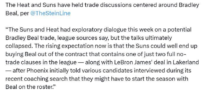 比尔昔日与奇才签订顶薪合同时,因为加入了交易否决权,从而导致太阳交易比尔存在巨大的障碍。上赛季太阳就在兜售比尔,却并未能够成功,如今太阳依然渴望兜售比尔,但因为他还剩下2年1.1亿美元的大合同,也是无人问津,他们与热火的交易谈判已经失败。