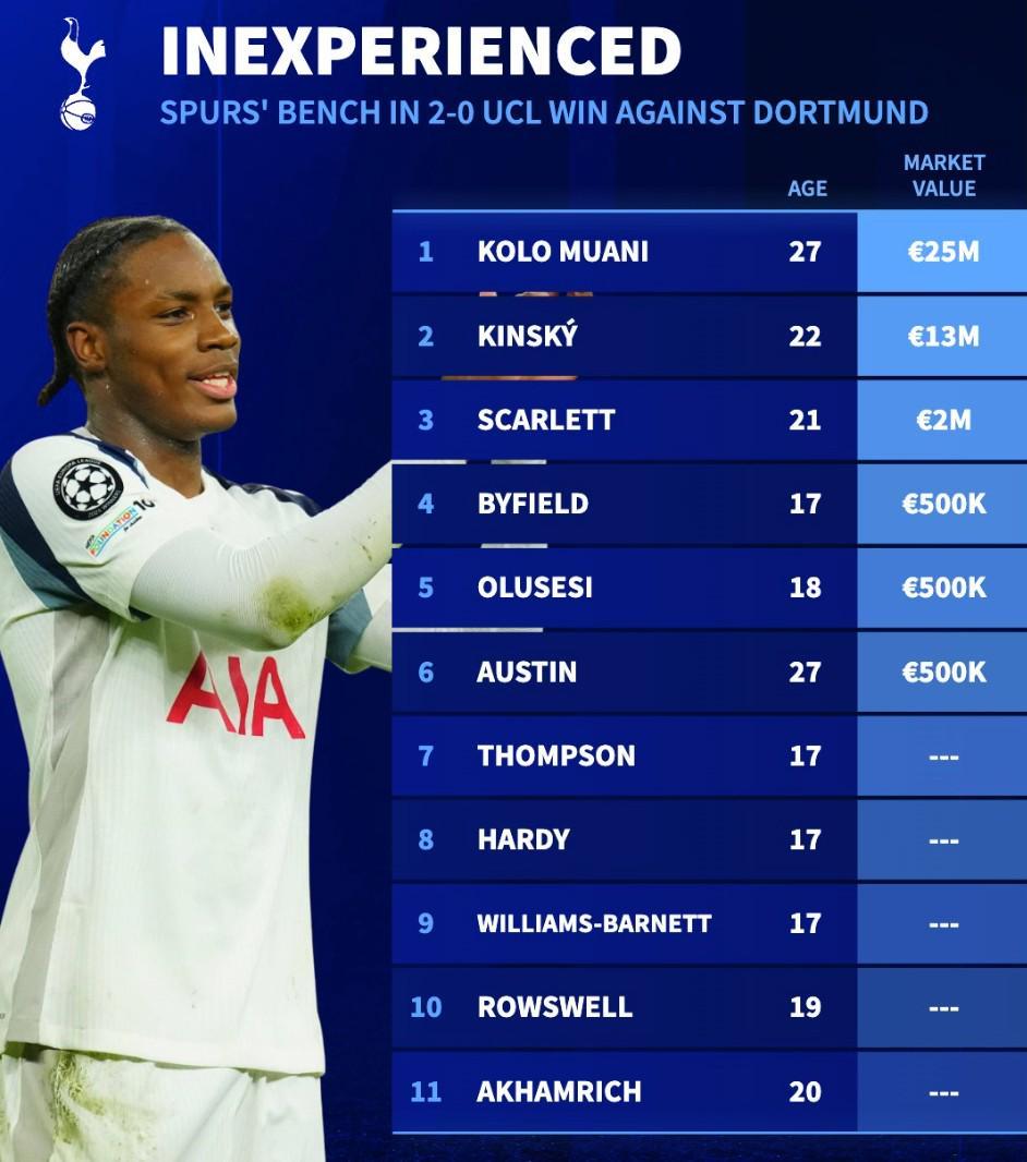 德转的统计同时指出,在欧冠联赛阶段第7轮热刺主场2-0击败多特蒙德的比赛中,热刺替补席上的11名球员中有5人甚至在德转上都没有身价,剩余6人总身价也仅为4150万欧元。