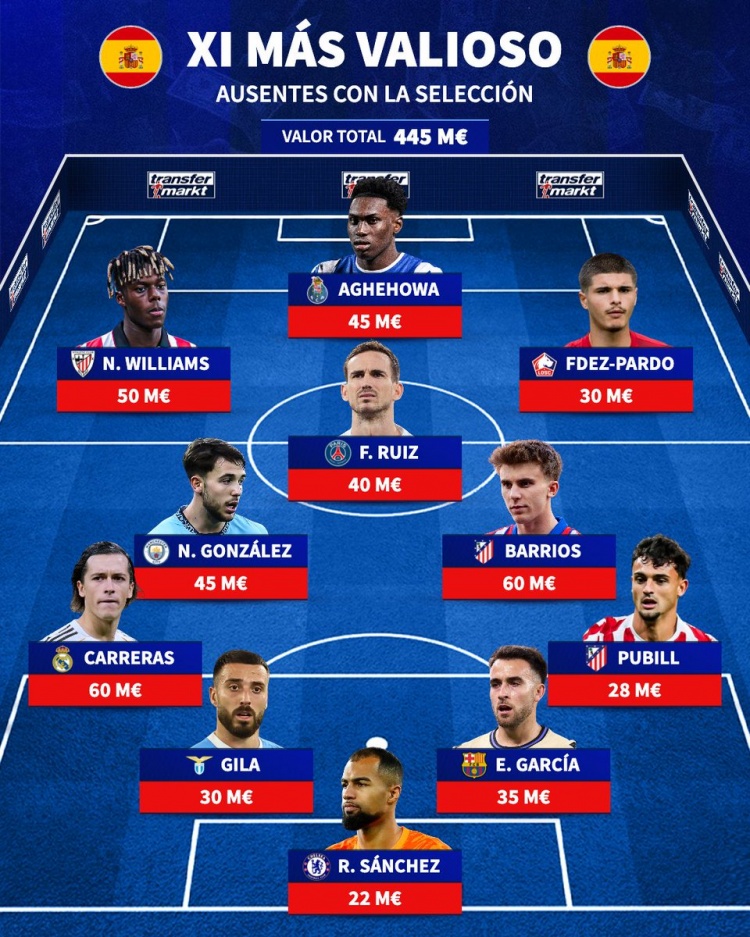 3月30日讯 德国转会市场列出了缺席本期西班牙队名单球员身价最高阵容,总价4.45亿欧。